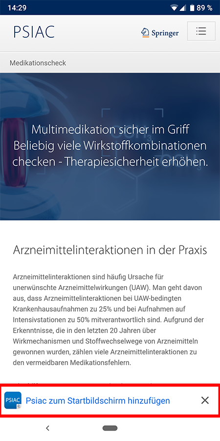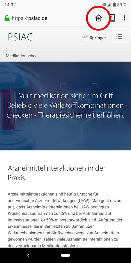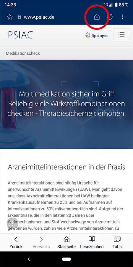 Drücken "PSIAC zum Startbildschirm hinzufügen" am unteren Rand des Browsers